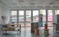 Im Erdgeschoß ist ein Werkstatt-, Lager- und Vorführbereich, hier wurde die Fensterfront mit einem abstrakten Bild versehen. Mit dem Motiv vermitteln wir dem Kunden das Hauptgeschäftsfeld: die Glasfasertechnik, außerdem dient die Kaschierung als Sichtschutz.