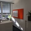 Zuerst wurden Pinnwände mit einer absorbierenden Funktion bei den Arbeitsplätzen installiert. Die Bespannung der Pinntafeln wurde individuell mit Filztuch in weiß und orange realisiert. Die Präsentation mobile Akustik Stelen und Pintafel sehen.